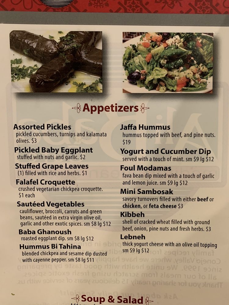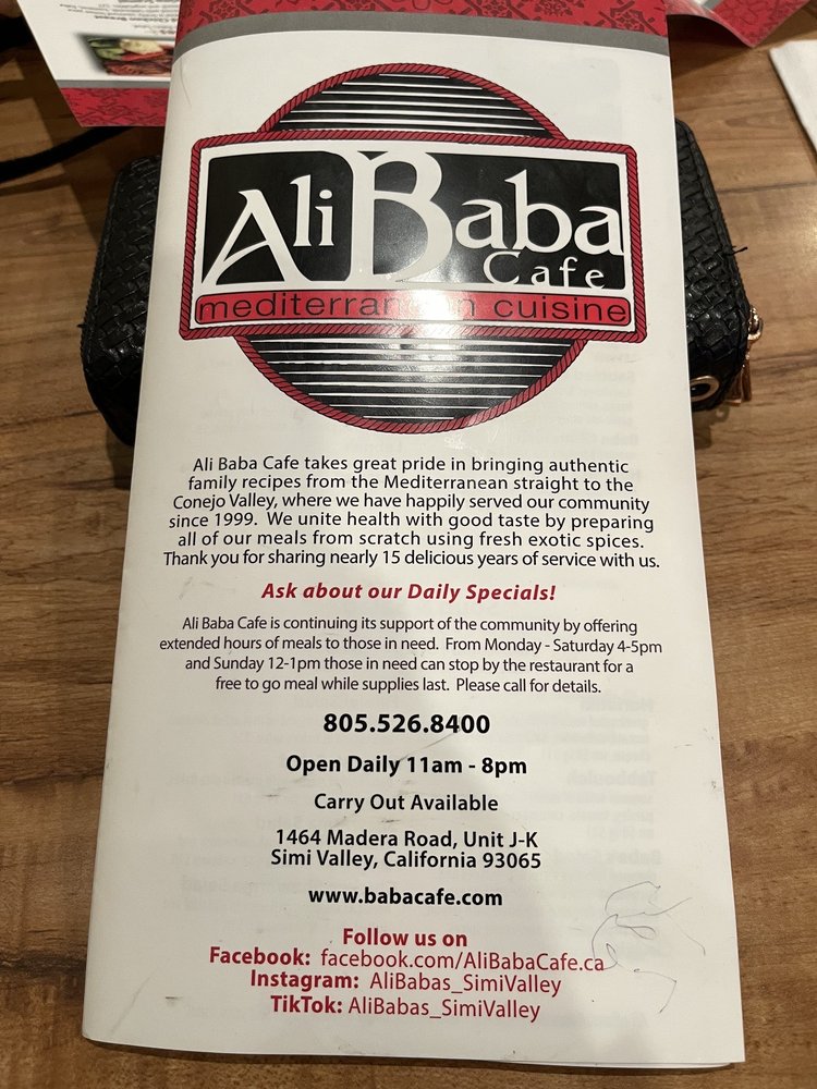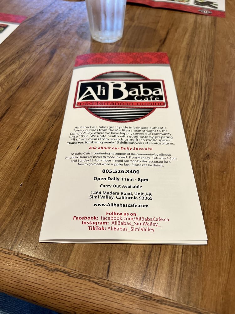 Introducing the menu at Ali Baba's Cafe, a hidden gem in Simi Valley offering delectable Mediterranean cuisine. With a diverse menu including favorites like lamb shawarma, falafel salad, and chicken kebabs, this restaurant has something for everyone. Customers rave about the flavorful dishes, generous portions, and attentive service. The soothing mint tea, baklava, and homemade hummus are must-try delights that will leave you satisfied. The ambiance is immersive with Mediterranean art and decor, adding to the dining experience. Whether you're looking for a quick lunch or a relaxed dinner, Ali Baba's Cafe is the perfect spot. Don't miss out on this culinary treasure in the heart of Simi Valley.