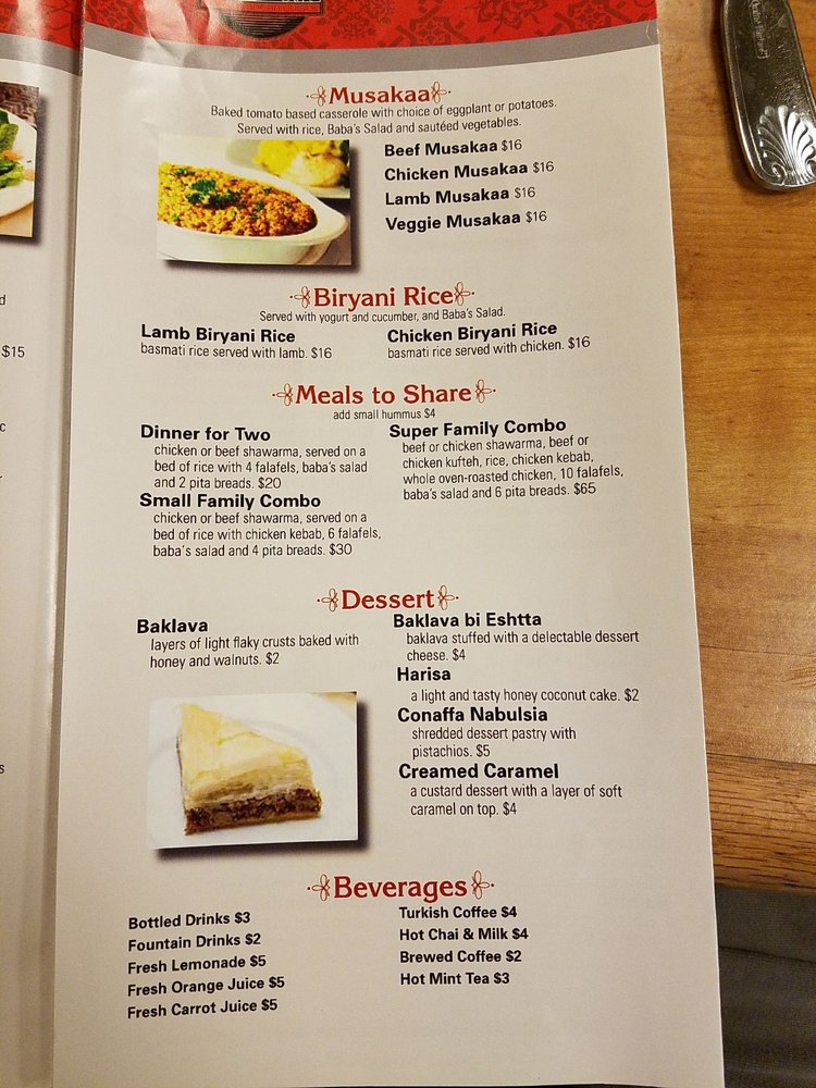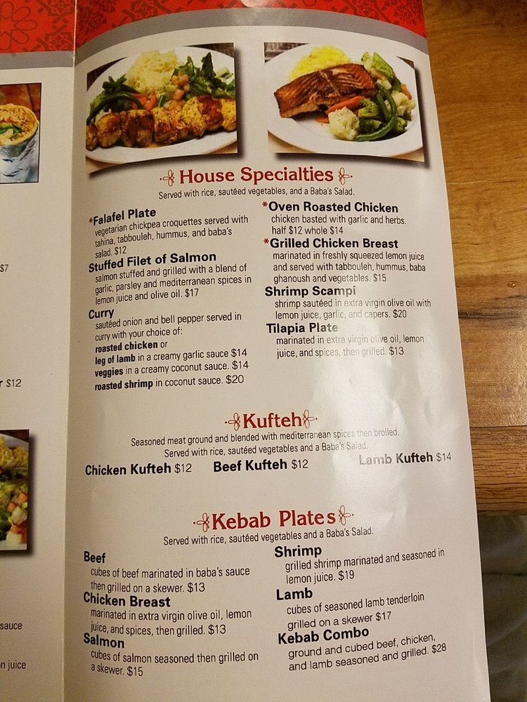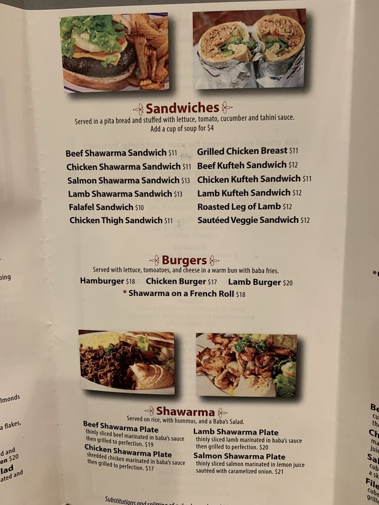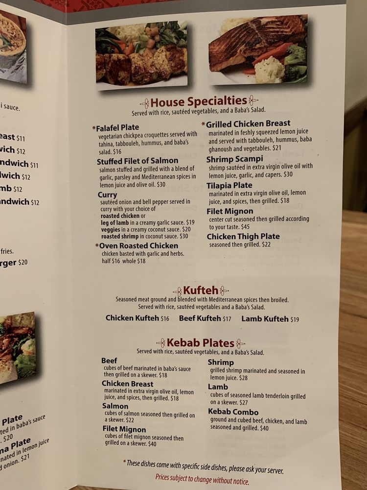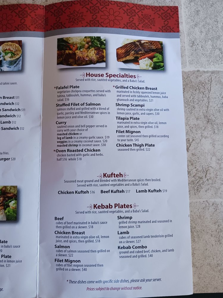 Beef or chicken shawarma, beef or chicken kufteh, rice, chicken kebab, whole oven roasted chicken, falafels, baba's salad and pita breads